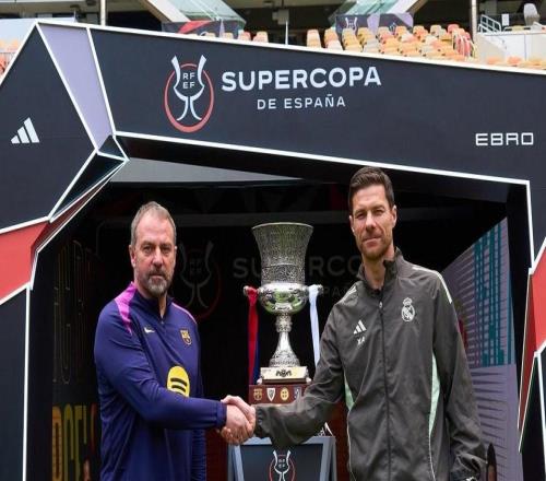 传统环节,西超杯决赛前弗里克和阿隆索在奖杯前合影 -